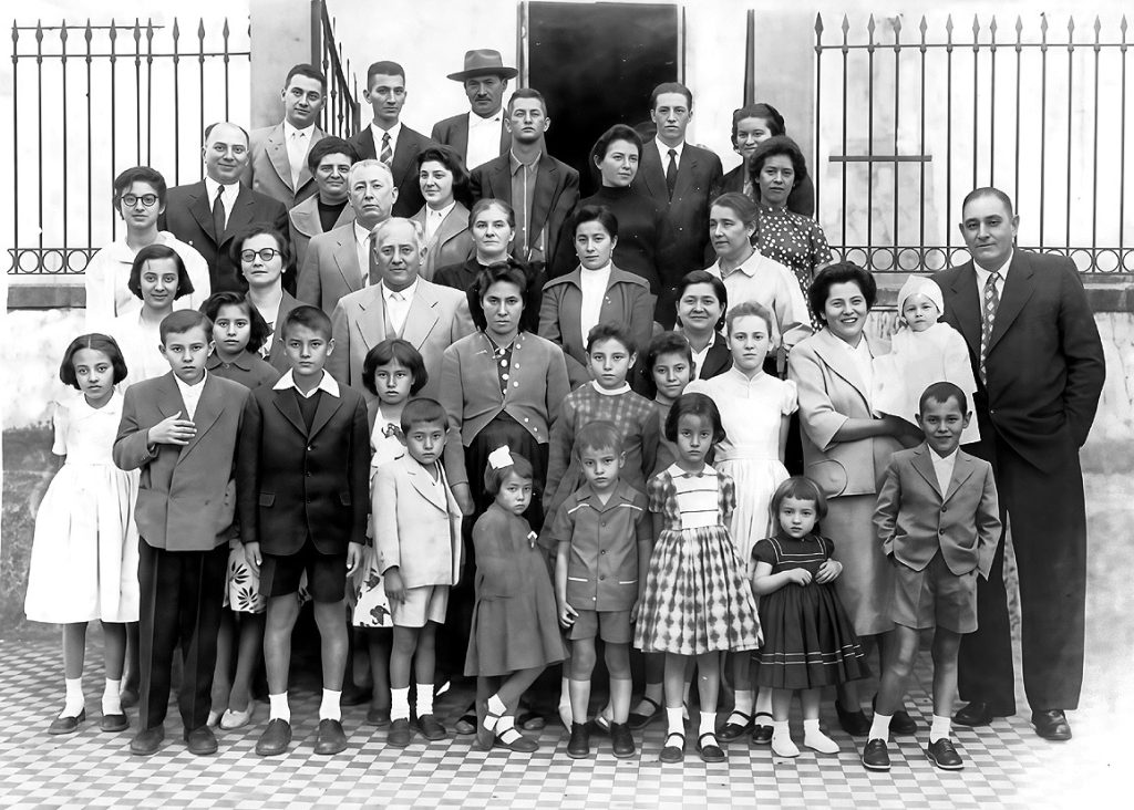 Faria, Miguel Russo, Ignez Tafner Russo, Leduino Paschoalotti, Maria Oneyde Russo, Adelina Bonetti Bonaldo e não identificado; na terceira fila, Maria Aparecida Faria, Lourdes Faria, Estevão Faria, Octávia Tafner Paschoalotti, Luiza Alpi, Luiza Marco Cecília e Luiz Bueno da Silva (Luiz Matias); na quarta fila, Lourdes Pereira de Moraes, Maria Machado Pereira de Moraes, Carlota Gonçalves Silveira, Suzana Gonçalves